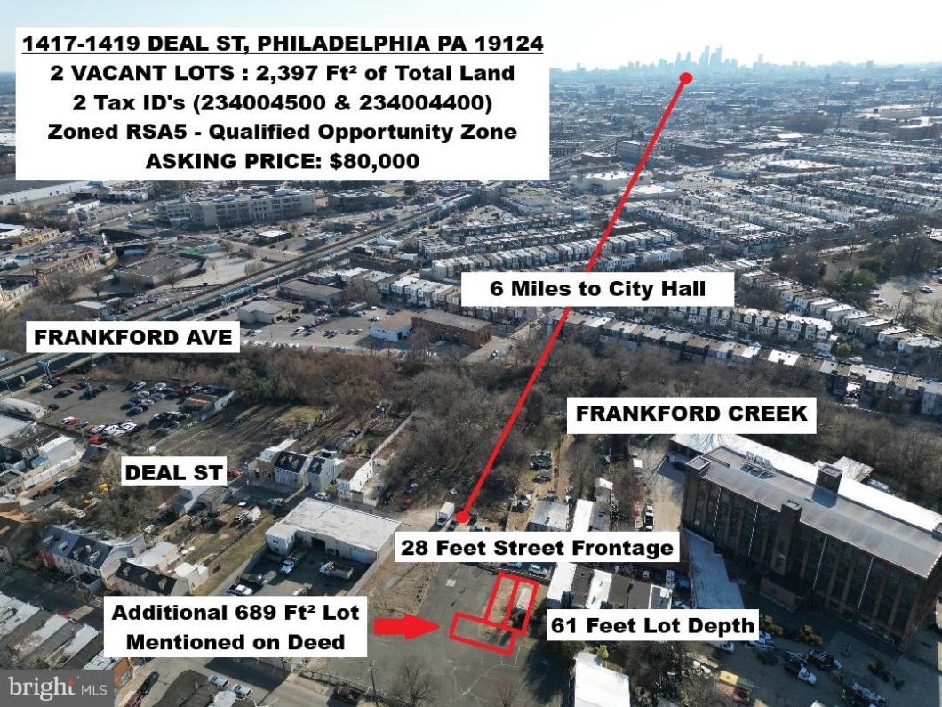Two Tax Id’s (234004500 & 234004400). The rear unmarked or unnumbered parcel is mentioned on the deed of one of the properties in this package. The total land size of the package is 2,397 Ft². Must buy both. Both lots are zoned RSA5 and are situated in the qualified opportunity zone. One block off of Frankford Ave and the El Stop which gets you into Center City Philadelphia in 10 minutes (roughly 6 miles to City Hall). Right across the street from Frankford Creek. Dead End block in Frankford. Street frontage is 28 feet. There is a box container sitting on 1417 Deal St which could temporarily be rented or used for storage. Excellent building site close to rapidly developing Kensington and Frankford. Sitting next to a large empty lot owned by the government.